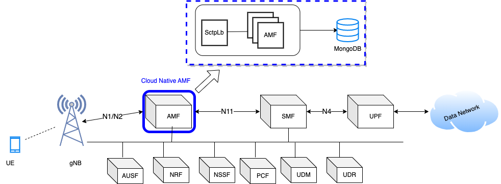 To make AMF cloud native application enhanced the existing design of AMF. Introduced a new service called SctpLb (SctpLoadbalancer) which receives ngap messages and distribute to Amf Instances. Also added DB support to Store UE Context. On successful completion of each procedure UE Context create/update/delete in MongoDB. AMF is tested with simulated gNB/UEs (gnbsim) for its stability.